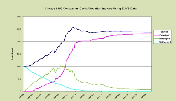 The 1995 vintage was the best year to date for venture capital. In the graph above, the turquoise line represents uncalled capital (per $100 of total investment for the vintage), the green line is the total value of private company value in the portfolio, the purple line shows the exit value from IPOs and acquisitions (carried forward at zero interest) and the dark blue line is shows the total value, which is the sum of the other three.